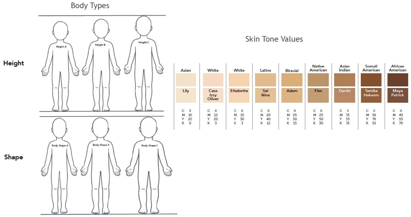 Body shapes and heights were established. Skin tones assigned to each character by ethnicity.